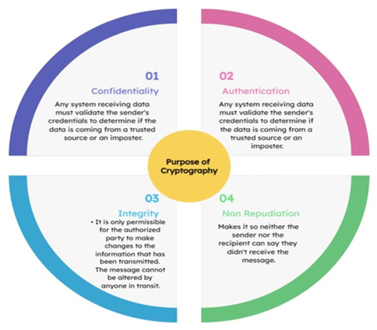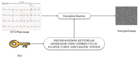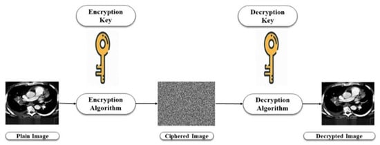 Electronic health records (EHRs) are a type of digital health record that is regularly created, updated, and disseminated online to facilitate efficient, accurate data collection thanks to the proliferation of smart and intelligent technologies [1,2]. A patient’s electronic health record is a collection of data about the patient maintained by the relevant healthcare providers, including the patient’s demographics, medical history, symptoms, and other relevant data. Images sent over the internet are vulnerable to eavesdropping, tampering, unauthorized duplication, and other forms of theft because they are sent in clear text. With today’s heavy reliance on electronic communication networks, protecting private information is more important than ever [3]. In light of this, there has been an increased focus in recent years on protecting the image in an effective manner. The fundamental concept is to encrypt these images with an algorithm so that an adversary cannot decipher any salient data. The techniques are extremely sensitive to changes in starting point, parameters used for control, periods, ergodicity, and even the appearance of randomness. The term “cryptography” refers to either the practice of encrypting data or the study of how such data is encrypted [4]. Before being transmitted via public networks, the actual data are first transformed into a representation that is meaningless without additional information. One of the most frequently suggested methods for ensuring the safety of medical images in the healthcare industry is encryption [5]. In this plan, the original image is transformed into a cipher image, and only authorized users are able to view its contents [6]. This prevents unauthorized users from gaining access to the data. Cryptography is frequently employed now because of the considerable security benefits it provides. The numerous motivations behind the use of cryptography are listed below in Figure 1. In general, there are two main categories that can be used to categorize encryption methods: symmetric and asymmetric procedures. To secure an image using symmetric encryption, it is essential to maintain a singular key. Conversely, the utilization of asymmetric techniques necessitates the preservation of two distinct keys [6]. Figure 2 shows the basic procedure for medical image encryption.