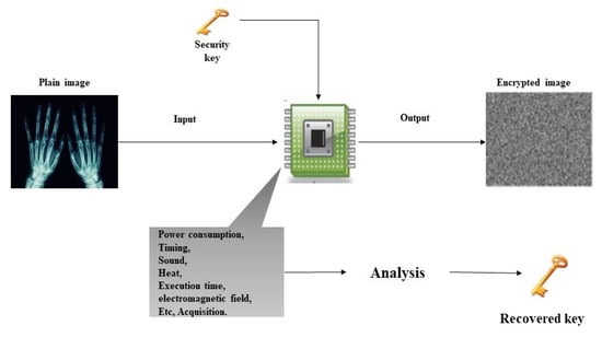 - Side channel attacks (SCAs): The use of Side-Channel Attacks, also known as SCAs, has become an efficient method for getting confidential information from cryptographic devices, which poses a significant risk to the devices’ level of security. Kocher introduces the concept of a side channel attack in the form of a timing assault, where an attacker monitors how long it takes a device to carry out a series of calculations and uses that data to learn more about the crypto-system [14]. He also has demonstrated that the key can be revealed through the cipher’s non-constant execution duration. A side-channel attack, in general, is a case where we have a security algorithm such as encryption, inputs and outputs, and a key that is super secure, and nobody is able to know that key. The entire security of the algorithm relies on this, or it is designed to protect that key. An adversary can gather information by monitoring the system’s power consumption, electromagnetic field (EMF), computation time, and memory access patterns rather than plaintext or ciphertext messages while it manipulates data. The attacker then looks into the relationships between the signatures observed in the side channel and the signatures predicted from the intermediate data and computation states. Private information may be leaked or made public as a result of this procedure. There are two distinct types of SCAs, namely profiled and nonprofiled assessments [15]. There are two stages to a profiled SCA: the profiling phase, during which an adversary is given a training device to test, allowing him to characterize physical leakages and obtain a precise leakage model, and the online exploitation phase, during which an attack is mounted against a similar target device in order to extract the secret key. SCA is shown in Figure 4 [16].