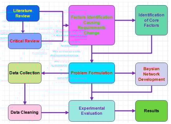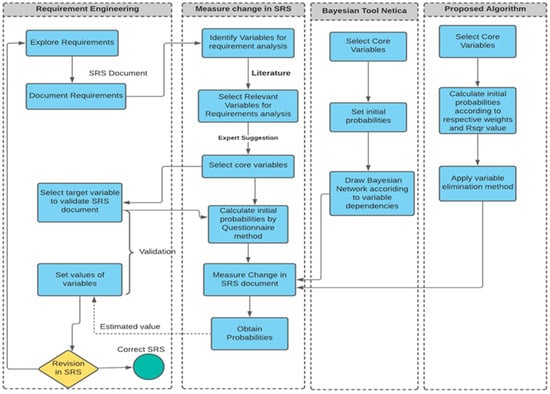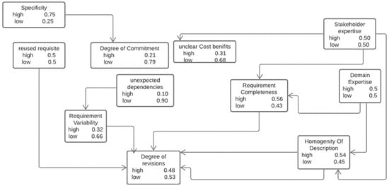 The software industry plays a significant role in improving human life, ranging from businesses, communication, entertainment, education, and a lot more. Software is an integral part of devices, applications, and systems on which people rely for various daily tasks []. Besides their numerous benefits, faulty software applications also have negative effects on human life; for example, in the case of a fault in a safety critical system, software can create life-threatening situations. Similarly, in the case of business applications, software faults can derail software productivity or operations resulting in an increased cost and time. To cater to these conditions, the software industry encompasses various activities, during software development, testing, deployment, maintenance, and support. As a result of these activities, software is becoming technologically advanced, struggling to address the ever-expanding business requirements, along with the preferences of various stakeholders []. Similarly, software engineers also face challenges in adapting to new circumstances []. In order to quantify the efforts of a change in software under development, a few works have been proposed for small-scale software systems [,]. Small-scale software systems have attracted much attention recently because most of the small software companies do not have properly defined procedures to face these challenges, which leads to failures. As the software requirements can change at any phase of the software development because of a change in stakeholder needs resulting in an increased cost, tightening of the schedule, and issues of scalability []. Therefore, there is a need to predict the change in software requirements at the early stages of development. Studies have illustrated that an error occurring in the development phase takes approximately 8 h to be resolved, whereas if it occurs in the requirement phase, it might take only 15 min to be resolved [,]. In software development, requirement gathering is the first step, where artificial intelligence (AI) tools, along with expert judgment, can be used to predict changes in software requirements []. In this regard, researchers have focused on how to also incorporate human experience into AI to predict change accurately [,]. Currently, most prediction models only utilize expert knowledge and consider a limited set of software metrics that represent different aspects of software, such as ambiguity, coupling, completeness, etc., to develop change prediction models []. The core requirement metrics with the knowledge of all the domain experts, including stakeholders and developers, are included in the prediction models. In this case, the probability of software requirement changes can be decreased, and the results can be improved []. The stakeholders describe the user requirements, use cases, and events; thus, they can have a vital role in defining the system requirements functions and operations. Moreover, the developers could provide a detailed system design and implementation description []. In contrast, in the AI field which is based on classification, learning, and prediction, certain authors [,] have proposed models for the prediction of changes in requirements. In this regard, a probabilistic AI technique such as Bayesian probabilistic reasoning can be used that is closely related to software engineering.