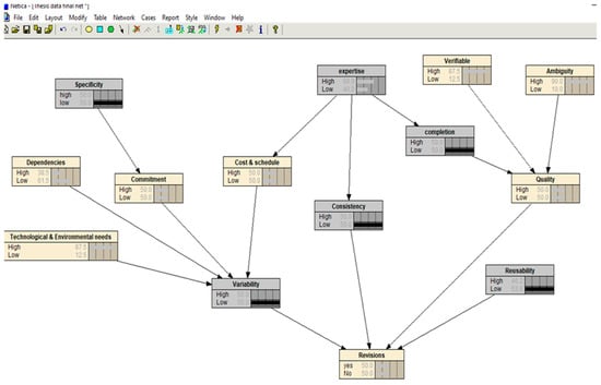 In this network, the dependent variables are commitment, cost and schedule, quality, consistency, variability, and revisions. Furthermore, the independent variables are specificity, dependencies, technological needs, expertise, verifiable, ambiguity, completion, and reusability. The initial probability values of nodes are set to low, and high. By selecting the states, the dialog box is settled to discrete variables. The probability is measured in percentage for each variable. To perform the inference, the model is made capable of learning. For this purpose, an Excel data sheet is incorporated into Netica, which has the same name as the nodes and the frequency associated with the nodes. When the file is added into Netica, it will set the conditional probabilities in tables by reading the file. The data of the high and low states of the node variables are incorporated from the case file. Compiling and incorporating the different case files will provide the results for different states.