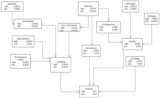 After comparing the results of both tables, we concluded that when the variability value is high, our proposed model calculated a 0.42 and 0.45 probability of revisions for both scenarios. Likewise, in the del Sagrado et al. [] model results table, when the requirement variability is high, it calculated a 0.51 probability of revisions; when it is low, it calculated a 0.44 probability of revisions. From the results, it is observed that there is a minor difference in the values of both models. However, the proposed model’s results are lower in each scenario, which means that the proposed model is better than that of del Sagrado et al. [].