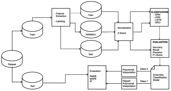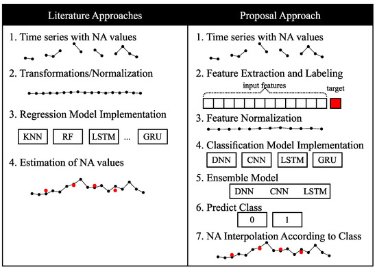 The main difference between the related works and the proposal is that these works to estimate NA values generally apply a regression model in some cases associated with a time series transformation. In our model, at the beginning, NA features were extracted and labeled; then, features were normalized; next, a time series classification task with deep learning models was performed, followed by the implementation of an ensemble model; finally the class of an NA value was estimated, and from this, the proper polynomial interpolation was performed to obtain the estimated NA value. Figure 2 summarizes this process.