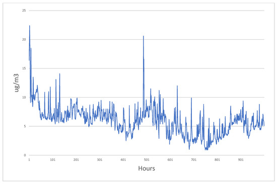 The hourly data used for this work were downloaded from OEFA’s server located at http://fiscamb.oefa.gob.pe/vig_amb/ accessed on 2 May 2023, and they oscillate between 1 August 2020 and 30 April 2023, corresponding to the Pacocha environmental monitoring station located at Ilo Province and Pacocha District in southern Peru. The downloaded data present several missing values, so the days that presented some missing values were discarded. After this process, the total available records numbered 56,424. As it is a regression problem, the dataset was just split into two sets (training and test) [30]. For training, 48,792 records were used (80%), and 7632 records were used for testing (20%). Figure 4 shows a sample of 1000 h of the selected time series. Data normalization was performed for extracted features during the implementation of classification models; it is described in Section 3.2.3.