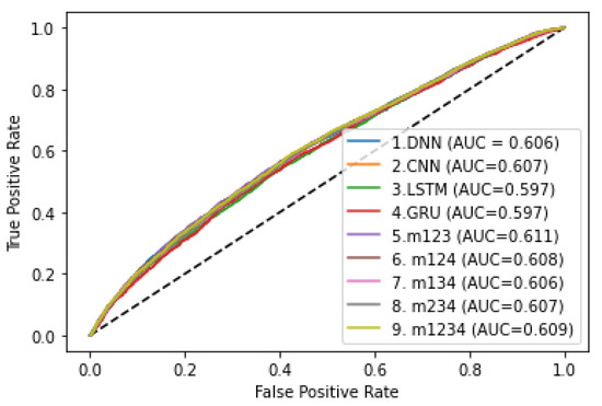 In order to improve the results, the strategy of implementing an ensemble model based on average was used. For this, it was experimented by assembling all the models and combinations of three models. Figure 8 shows the respective ROC curves, and as it can be seen, the ensemble model based on DNN, CNN, and LSTM presented the best area under the curve (AUC of 0.611), which is why this ensemble model was chosen for the imputation process. In terms of accuracy, recall, precision, and f1-score, the ensemble model reached 0.5859, 0.4045, 0.5457, and 0.4647, respectively.