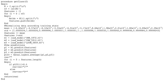 The .h5 files correspond to DNN, CNN, and LSTM models that are part of the selected ensemble model to estimate the classes of NA values. The Python function getClass receives as the input parameter the characteristics of all NA values to be estimated, and then, it returns the classes to which they correspond. Figure 10 shows such a function.