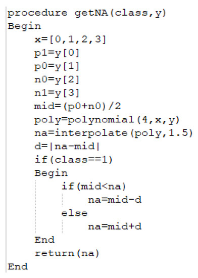 According to Figure 10, the getNA procedure for NA estimation receives as parameters the NA class and the vector y that contains the four values to be used by polynomial interpolation: p1, p0, n0, and n1. The p0 and n0 are interpolated, and mid is obtained; then, the coefficients of the polynomial function are obtained for the four values in y, and for this, a polynomial procedure is used (See Figure 12). With the polynomial obtained, the value in position 1.5 is estimated, which corresponds to the NA value according to Figure 1; for this, the procedure interpolate is used (see Figure 13), and for na, this is the final result for NA values of class 0. For the case of NA values of class 1, the na value is flipped; for this, the absolute distance d between the na value and mid is determined, and depending on the location of the na value according to mid, d is subtracted or added.