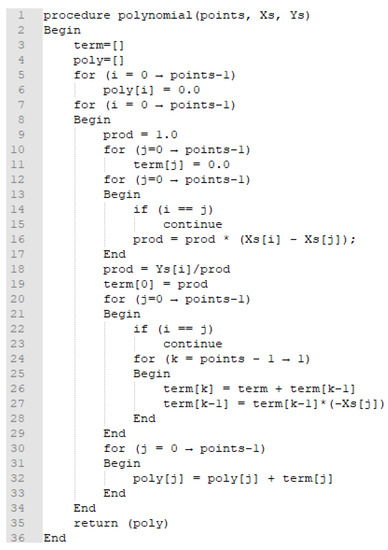 The polynomial procedure receives as parameters the number of points (points) and the vectors of values in x (Xs) and y (Ys). With these data, according to Equation (6), for each point, Equation (8) is estimated, and from this, Equation (9) must be estimated.