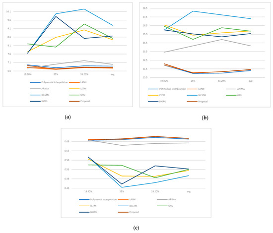 In terms of R2, according to Table 8 and Figure 14c, the proposal model outperformed all benchmark models in two of three NA sets. In the first NA set (19.98%), LANN was the best with R2 = 0.6911, followed by the proposal and polynomial interpolation with 0.6879 and 0.6861, respectively. In the second NA set (25.00%), the proposal was the best with R2 = 0.6941, followed by LANN and polynomial interpolation with 0.6916 and 0.6859, respectively. Finally, in the third NA set, the proposal was also the best with R2 = 0.7072, followed by LANN and polynomial interpolation with 0.7062 and 0.7018, respectively.