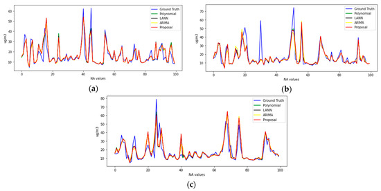First 100 predicted values: proposal vs. best benchmark models (polynomial interpolation, LANN, and ARIMA). (a) NA set 19.98%, (b) NA set 25.00%, and (c) NA set 33.32%.