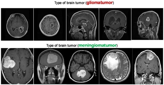 Additionally, we used the brain tumor dataset [31] for this study as an extra dataset for model training. Researchers from Nanfang Hospital, General Hospital, and Tianjin Medical University in China created this dataset. They used a database of pictures consisting of a collection of slices, each of which had an individual magnetic resonance imaging (MRI) scan obtained between 2005 and 2010. The first online version was released in 2015, and the most current was finished in 2017 [32,33]. Pituitary malignancies, meningiomas, and gliomas all accounted for 1426 slices, whereas 708 depicted meningiomas (930 images). Scans were acquired in three planes from 233 patients: sagittal (1025 images), axial (994 images), and coronal (1045 images). Figure 4 shows several different types of cancer on different axes. The edges of each tumor are a vivid shade of crimson. Each person is imaged an undetermined number of times.