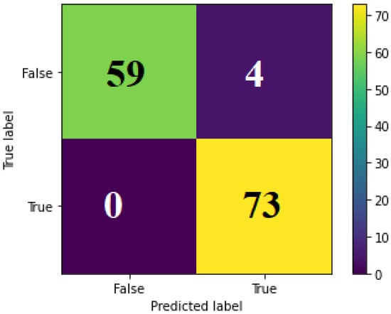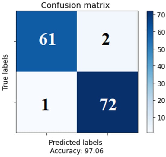 The average classification accuracy of the experimental studies is 97% with combined feature extraction. As can be noted from Table 1, the meningioma tumor prediction accuracy was higher than the glioma tumor, with an accuracy of 93% on images with glioma tumors and 100% on images of meningioma tumor. The errors in the prediction of glioma tumors in MRI images are about 6% with combined feature extraction. Figure 5 shows the confusion matrix of tumor prediction with HOG features and combined features (HOG + LPB).