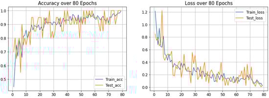 From Figure 5, we can see that the modified methodology for tumor prediction (combination of features HOG and LPB) is more accurate than using HOG features. The error rate by using a combination of LPB and HOG is 3%, while the usual method is 11%. Figure 6 shows the training and testing accuracy over 80 epochs, with four layers on a modified convolution neural network (MCNN).