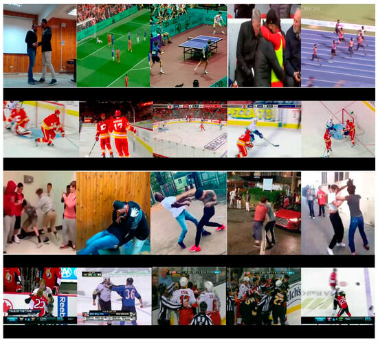 The first and second rows represent non-violent samples from the RLVS and Hockey datasets, respectively. The third and four rows represent violent samples from the RLVS and Hockey datasets, respectively.