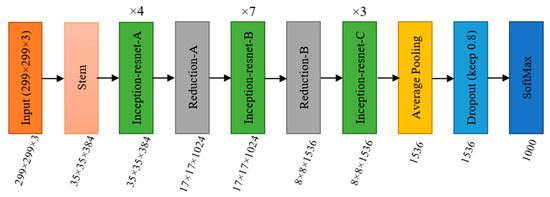 The InceptionResNetV2 is a modification of the Inception framework that incorporates residual connections [32]. This design combines the Inception module with the ResNet approach by using residual connections, which allows the network to learn more complex representations more quickly. The Inception module comprises multiple branches that uses different convolutional filters to learn features at various scales. The architecture also employs factorisation, which makes it more efficient and compact than traditional Inception designs. The network comprises two modules: the stem and InceptionResNet blocks. The InceptionResNet blocks increase the network’s depth, while the stem decreases the input’s spatial resolution. For more information, refer to Figure 3.
