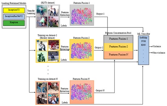 Surveillance cameras are widely employed in supermarkets, gas stations, streets, roads, cafes, and similar areas. They are commonly used to monitor suspicious activities, known explicitly as anomaly behaviours. These behaviours cover a wide range of actions, such as attacks, harassment, fights, robberies, and vandalism. Anomaly behaviour refers to actions that deviate from the usual norms within a given context. Regarding computer vision (CV), anomalies are identified via data patterns showing significant deviations from normal data [1]. Regrettably, significant amounts of time and money are dedicated to monitor and detect these activities without the support of automated systems [2]. This scenario emphasises the growing necessity for automated systems to comprehend and evaluate these actions. Machine learning (ML) techniques are crucial in providing efficient solutions for detecting anomaly behaviour, specifically for violence detection in video surveillance. Implementing these methods can significantly mitigate the risk of social violence [3,4,5,6,7,8,9,10,11]. ML algorithms usually rely on dependable features to accurately represent input data and classify output outcomes [12]. The precision of behaviour recognition is directly linked to the quality of the chosen features. Utilising empirically based feature extraction methods may lead to a decrease in classification accuracy. Deep learning (DL) employs neural network (NN) models to detect and capture characteristics from input data, eliminating the need for a distinct feature extraction stage. DL excels at efficiently classifying vast amounts of data and incorporating intricate features [13]. DL has a significant benefit in not requiring any preprocessing to obtain feature descriptions. The neural network can automatically determine numerous unknown parameters through the training process. While the training may be time-consuming, the outcome can be highly gratifying [14]. Convolution neural networks (CNNs) are powerful DL algorithms that can extract meaningful features from video frames and learn to classify them based on their content. Violence detection in videos involves identifying violent actions and events, which can be carried out by training a CNN on a labelled video dataset [6]. Training convolutional neural networks (CNNs) to achieve good performance requires vast data. However, the high data requirement poses a significant challenge. To address this issue, the idea of transfer learning (TL) has been widely accepted by researchers as a potential solution [15,16,17,18,19,20]. TL is a process where a pre-trained CNN model is employed for a new task [21]. The model is trained on a specific dataset and it learns features for a particular task. The model is then fine-tuned for the new task, even in a different domain. The potency of this concept has led to its widespread adoption in various image classification and action recognition tasks. Several studies have employed deep TL models for the automatic detection of violent scenes in videos, such as VGG16 [22], GoogleNet [19], InceptionV3 [17], and MobileNet [8]. However, existing methods employed in video anomaly detection frequently encounter challenges associated with generalisation, which pertains to a model’s capability to perform effectively on unseen data. The flexible integration of multiple models into a cohesive framework poses a common hurdle in this field. Moreover, the scalability of video anomaly detection becomes increasingly critical as datasets expand in size and complexity. Incorporating new datasets without requiring extensive retraining from the ground up is vital [23]. Furthermore, achieving accurate and discriminative feature representation remains a significant challenge in video anomaly detection. These aforementioned challenges have been specifically targeted and addressed by introducing novel approaches in this paper. DL has long been regarded as a complex and opaque process, often referred to as a “black box”. Unfortunately, a significant portion of the existing literature has failed to incorporate virtualisation techniques to elucidate the decision-making mechanisms employed by DL systems. Consequently, this lack of transparency can undermine trust in these systems’ final decisions [24]. In light of this concern, the present study employs the Grad-CAM method to address these limitations and provide a more comprehensive understanding of how DL arrives at its decisions. The primary contributions of this paper are outlined as follows: