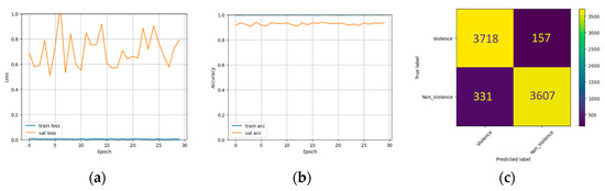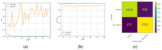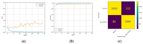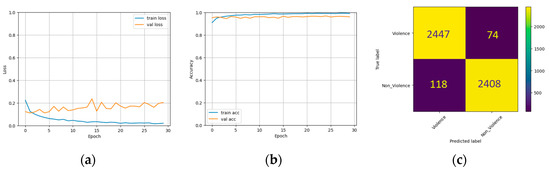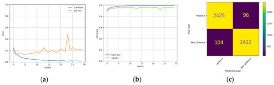 The experimental results on the RLVS dataset using Xception. (a) Loss with different epochs. (b) Accuracy with different epochs. (c) Confusion matrix.