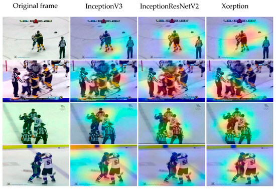 Grad-Cam with heatmap of violent behaviour in the Hockey dataset using Inception, InceptionResNet, and Xception.