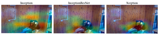Grad-Cam with heatmap of violent behaviour in the RLVS dataset using Inception, InceptionResNet, and Xception.