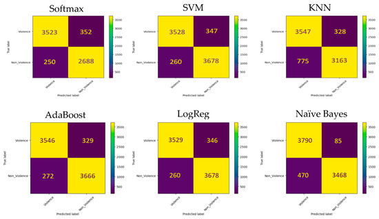 Confusion matrixes of SoftMax, BSVM, KNN, AdaBoost, LogReg, and Naïve Bayes classifiers on the RLVS dataset.