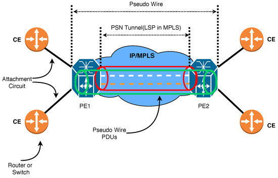 A Packet Switched Network (PSN) tunnel must first be created between the two edge routers, and then a PW will be created inside the tunnel. The common physical link is called the Attachment Circuit [35]. As shown in Figure 2, the router can take the frame from two sides. When the router shares a frame from a shared physical link, it performs a MAC learning procedure just like a Bridge module.