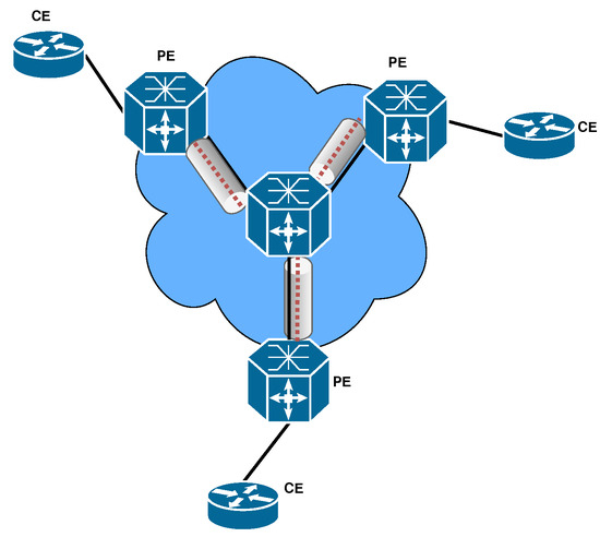 When VPLS was initially proposed, it was described as possessing a flat topology that was well-suited for small to medium-sized networks [10,41]. However, these flat topologies encountered significant scaling challenges in both the data and control planes as larger networks necessitated a complete mesh of PWs. To mitigate this issue, the H-VPLS design was introduced as a viable solution by reducing the number of PWs and effectively addressing the scalability concerns [15]. In response to the early obstacles pertaining to scalability, security, and neighbor discovery, MPLS (Multiprotocol Label Switching) was employed instead of VPLS. Subsequently, the Border Gateway Protocol (BGP) and the Label Distribution Protocol (LDP) were suggested as two standard implementations for signaling and automatic neighbor detection [16]. Consequently, multiple architectural designs were proposed to enhance the operational capabilities of these frameworks.