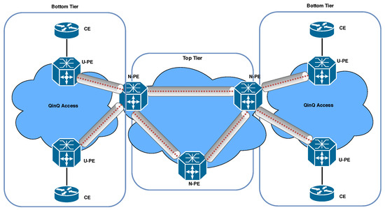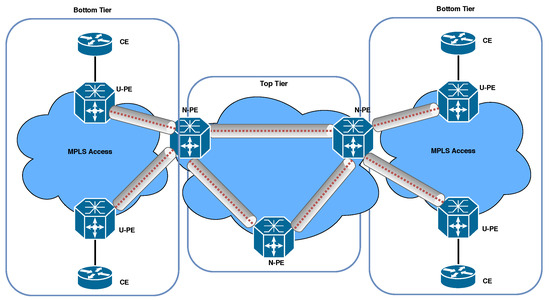 Figure 6. H-VPLS with MPLS access network configuration in MPLS environment. - H-VPLS with Q-in-Q Access Network: In the H-VPLS model proposed by the authors of reference [40], the Provider network is partitioned into ethernet-based islands, as depicted in Figure 7. These islands are interconnected using MPLS. Specifically, in the Bottom Tier of this architecture, PW Q-in-Q is utilized as the type of PW. The advantages of this topology, including easy availability through ethernet and hierarchical backing via Q-in-Q access, scalable customer VLANs (4K × 4K), and supporting 4K customers per access domain, have encouraged us to implement this model.
