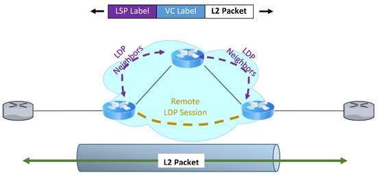 - Martini, L.; Rosen, E.; El-Aawar, N.; Smith, T.; Heron, G. RFC 4447: Pseudowire Setup and Maintenance Using the Label Distribution Protocol (LDP). The Internet Society. 2006. Available online: https://www.rfc-editor.org/rfc/rfc8077 (accessed on 8 August 2023).