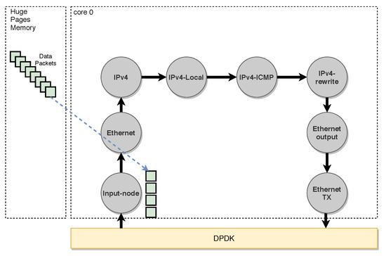 As the VPP architecture is based on graph nodes, there are two types of nodes in VPP architecture: internal and input nodes [23]. Input nodes denote nodes that inject packets into the graph, whereas internal node denotes nodes that contain codes to run on packets. As shown in Figure 9, it is implied that the VPP graph is copied to each core inside the CPU and, on the memory side, VPP creates huge pages to accommodate more incoming packets. These packets then traverse the graph in a pipeline manner. The dispatch function in VPP takes up to 256 packets and forms them as a single vector element. When the first packet goes into the core, the l-cache gets warm by having the code of the first node inside it and, for the rest of the packets, there will be no cache misses for executing that node.