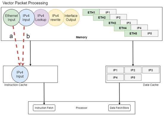 There are a lot of workflow graphs for packet processing inside VPP, and also the user can attach their workflow to the main graph of VPP. The fundamental gain VPP brings is cache efficiency. In particular, there are two distinct caches: Instruction Cache and Data Cache. The former is for caching instructions and the latter is for caching data. According to Figure 10a, when the ethernet header is about to process, for the first time, the node which represents the ethernet header process instruction is transferred to the instruction cache due to cache miss. After that, for the rest of the headers, the instruction code will have remained in I-cache. After finishing the batch processing of the vector of packets, it is time for the processing of the IP headers (Figure 10b). Therefore, VPP batches IP headers and puts the vector inside D-Cache. At this time, the node which represents the instructions for processing the IP header is transferred to I-Cache due to cache miss. So, in essence, the cache miss for instructions is reduced significantly.