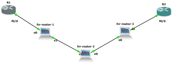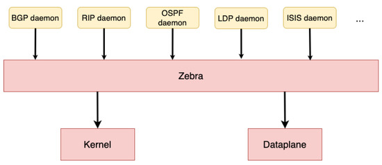 The control plane is responsible for signaling and managing routing tables [5,52,53]. FRR is an open-source software stack on Berkeley Software Distribution (BSD)-based systems [18]. It is the control plane of many systems, such as virtual routers and white box switches. The FRR project is the continuation of Quagga (as an open-source project which implements routing stack) [54]. FRR itself, as a control plane, implements various kinds of routing algorithms on Linux Kernel as the data plane, and it is also inter-operable with other vendors’ systems such as Cisco, Juniper, and Huawei.