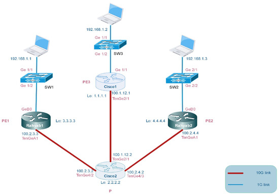 In this topology, the devices are connected according to Figure 16 to establish VPLS in the practical scenario which is based on a real-world scenario that can highlight the contribution of our work. In this test, the Rahyab1, Rahyab2, and Cisco1 routers are acting as PEs and the Cisco2 router is acting as P. Sw1, Sw2, and Sw3 switches are defined CE. All PE routers have VPLS connection configuration. Furthermore, we have changed the VLAN tag on the switches and defined them all as VLAN 100. The output link of the switches is set to the trunk port.