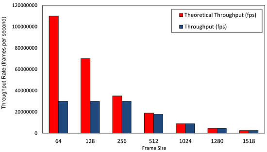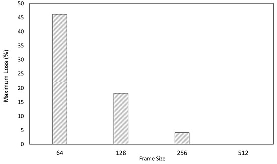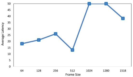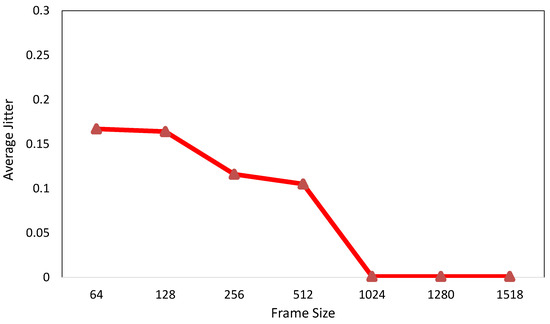 Moreover, the average amount of the small and big frames’ jitter is less than 1 μs, as shown in Figure 19. It is important to note that the average jitter for frames larger than 1024 bytes is, relatively, in the order of nanoseconds, which is three orders of magnitude smaller than that of small-sized frames. Moreover, as shown in Figure 20, we discussed queue build-up in small-sized frames. One of the causes of long queues is tail packet loss. Because the size of frames is short, there will be a huge number of incoming short frames, and as a result, they will create a long input queue and increase the probability of frame drop at the tail of the queue. The size of the frames can affect the distribution of traffic in the network. If frames of different sizes randomly enter the network, smaller frames (such as 64 and 128 bytes) may act as a noise load in the network and cause more interference, leading to an increased packet loss ratio.