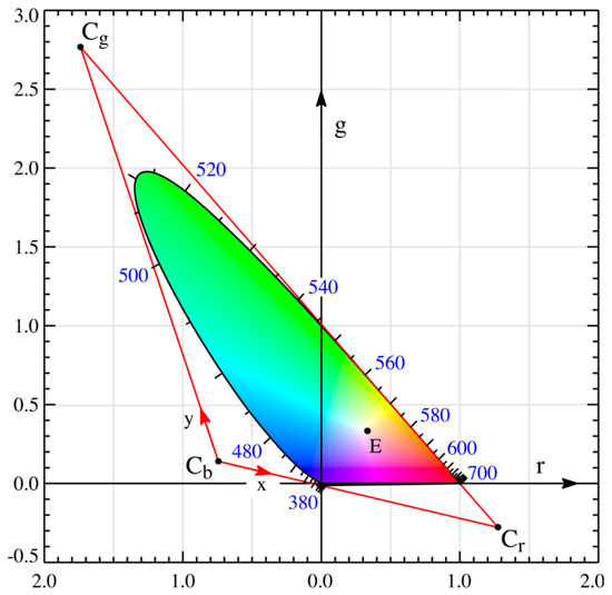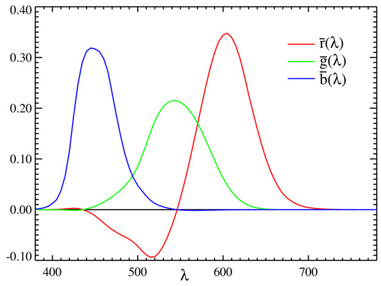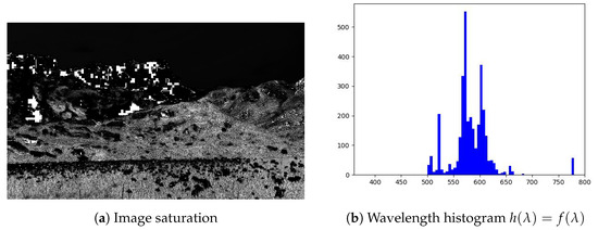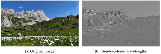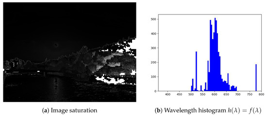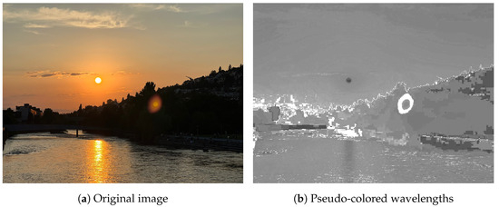 Interestingly, accurately computing the wavelength of a color c given in RGB (red–green–blue) is not a simple task. Images are captured using the Bayer array and primarily stored in the RAW format at the best of the camera sensor’s performance. The Bayer array is usually formed as four color filters in configurations , , or [18,19,20,21]. However, images are converted to the JPEG format due to data compression, which is lossy and introduces some color artifacts. Wavelength representation is used in many applications, e.g., processing of satellite multispectral images [22,23,24], vegetation production [25,26,27], object detection [28], spatial image processing [29], and underwater image processing [30], etc.