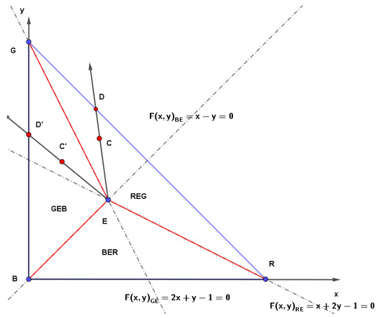 The function serves as a separation function, and it has a positive value for colors in the red (R)–white (E)–green (G) sector of colors. This means that given a point in the chromaticity space, if , the color falls within the red–white–green sector. On the other hand, if , the color falls within the green–white–blue sector. This function helps in determining which sector the given color belongs to. The specific equation for is .