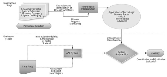 A longitudinal design was employed for each case study, wherein the adaptability of the AAC system was assessed in both simulated and real-life scenarios. The precise diagnosis of the disease state and the determination of the system’s efficacy were both significantly influenced by the evaluation of proficient neurologists. Finally, in stage fourth, a quantitative and qualitative evaluation was performed, recording time metrics, errors and using specific questionnaires to assess the efficiency, effectiveness, ease of learning, satisfaction, and overall usability of the system.