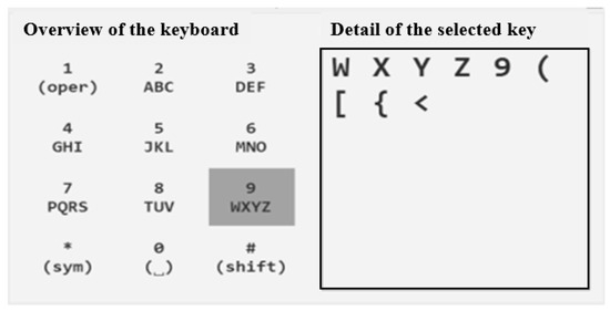 The AAC system was implemented using the C# programming language. Its design was inspired by a classic mobile phone keyboard and is based on an indirect access approach called “scanning”. In this system, a periodic left-to-right scanning is performed at regular intervals. The user must generate an event when the system reaches the group of characters where the desired character is located. Similarly, another event must be produced when the system reaches the specific desired character.