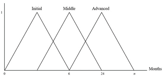To project these rules into the form of fuzzy logic equations, we will use triangular membership functions for each of the stages (initial, middle, and advanced). The membership functions have been previously: Equations (1)–(3).