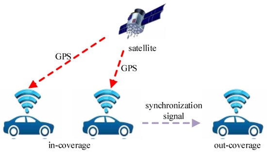 As the first C-V2X solution proposed by China Datang [4,7], LTE-V2X incorporates several enhancement technologies to address the challenges posed by high-speed node movement, low latency and high-reliability transmission requirements in V2X communication. Enhanced synchronization technology stands out as a key component of these enhancements [8,9]. As illustrated in Figure 1, synchronization enhancement technology enables nodes equipped with Global Navigation Satellite System (GNSS) modules to achieve direct time–frequency synchronization through the GNSS. However, since V2X scenarios can also include tunnels and densely populated high-rise urban areas where GNSS signals may be obstructed, a significant portion of nodes still relies on synchronization signals broadcasted by the upper synchronization source to achieve precise time–frequency synchronization. In such scenarios, the dependence on synchronization signals becomes crucial for ensuring accurate time–frequency synchronization.