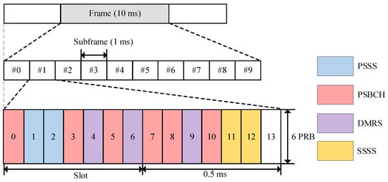 The LTE system’s physical layer is traditionally divided into the uplink and downlink. In contrast, the physical layer of LTE-V2X, known as the sidelink, has evolved based on LTE-D2D technology, inheriting most of the air interface characteristics [21]. To address the limitations of mobile terminal transmission performance, LTE-V2X employs SC-FDMA to convert frequency domain signals into time domain signals, mitigating the Peak-to-Average Power Ratio (PAPR) effect. Physical channels in LTE-V2X are categorized based on their functions, including broadcast, discovery, shared and control channels. Figure 2 illustrates the placement of the Sidelink Synchronization Signal (SLSS) in the physical sidelink broadcast channel (PSBCH).