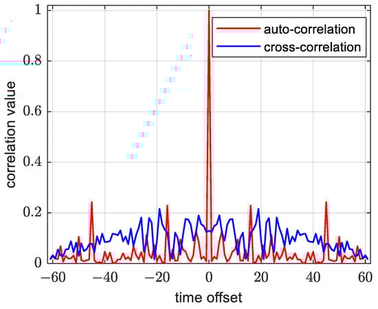 Due to the inherent properties of the ZC sequence, the PSSS exhibits excellent auto-correlation and cross-correlation characteristics, as illustrated in Figure 3 below. During auto-correlation operations on an identical PSSS, a prominent ‘peak’ is observed at the zero point, indicating a large correlation value. Conversely, when performing cross-correlation calculations for distinct main synchronization signals, the correlation value is nearly zero. These properties of the PSSS establish a robust foundation for its detection in the terminal. Furthermore, the PSSS possesses time domain symmetry, implying that its time domain representation is centrosymmetric. This particular property can be leveraged to reduce the complexity of the synchronization algorithm [22].