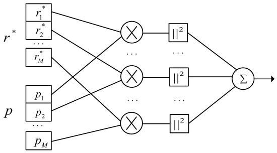 Due to the poor performance of the cross-correlation algorithm in a large frequency offset scenario, the literature [23] proposes the block cross-correlation algorithm, which reduces the length of the effective sliding window by dividing the received signal and the local pilot into several blocks to reduce the cumulative effect of frequency deviation. Figure 5 shows the algorithm flow. In the figure, “*” represents the conjugate operation and r* is the conjugate of the received signal, p represents the local pilot, and M is the number of blocks for the received signal and the local pilot. Each sequence is operated separately, and the modulus squared is superimposed.