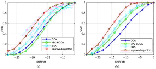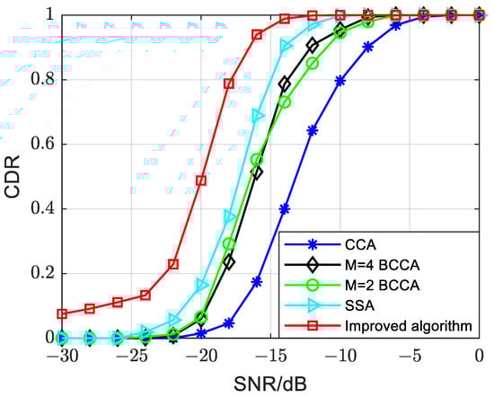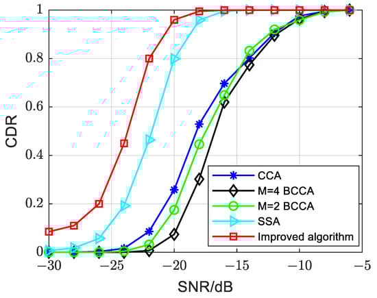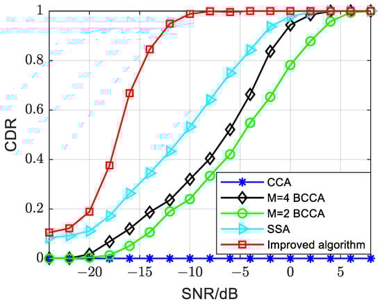 - The proposed improved algorithm in this paper exhibits significant improvement in PSSS detection compared to other algorithms. The enhancement is approximately 6–8 dB compared to the CCA, M = 4 and M = 2 BCCAs and around 2 dB compared to the SSA. The improved algorithm maintains a CDR close to 0.9 even at −20 dB.