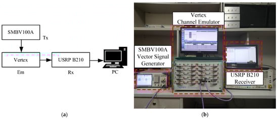 Figure 12 illustrates the hardware-in-the-loop simulation platform, comprising the SMBV100A vector signal generation source from Rhodes and Schwartz as the transmitter, the Vertex channel emulator from Spirent and the receiver consisting of the Universal Software Radio Peripheral (USRP) B210 and a Personal Computer (PC). During the hardware-in-the-loop simulation, the configured LTE-V2X signal is fed into the SMBV100A and continuously transmitted to the Vertex. Simultaneously, the USRP B210 receives the LTE-V2X signal passing through the channel emulator. The PC processes the collected LTE-V2X signal from the USRP, facilitating a performance comparison of symbol time synchronization under different channel conditions.