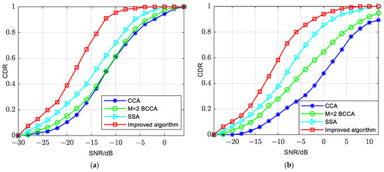- The improved algorithm enhances PSSS detection performance when the velocity is 0 km/h in this scenario. The improved algorithm can maintain a CDR close to 0.9 at −14 dB, the SSA achieves a CDR of 0.9 at −12 dB, and the M = 2 BCCA and CCA reach a CDR of 0.9 at −10 dB. Therefore, the SSA is approximately 2 dB worse than the improved algorithm, and the M = 2 BCCA and CCA are about 4 dB worse than the improved algorithm.