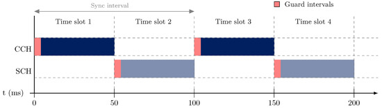 On the other hand, the IEEE 1609.4 protocol is in charge of multi-channel operation, which works as follows: there is a Control Channel (CCH), through which vehicles transmit safety messages and beacons with vehicle information, and there are four Service Channels (SCHs), through which vehicles transmit the applications’ data. The IEEE 1609.4 protocol applies a Time-Division Multiplexing (TDM) to divide the wireless channel into two slots/subchannels, the CCH (control) and the SCH (service), in order to guarantee critical control message exchanges inside a bounded delay window of up to 50 ms. As depicted in Figure 1, at the beginning of each time slot, there is a guard interval (4 ms), which is used to guarantee that every device has completed the switching to the corresponding channel.