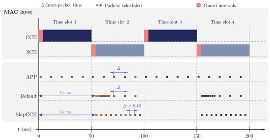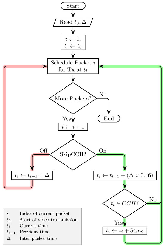To avoid the aforementioned issue, we have proposed a new method (which we have named SkipCCH) [28]. In our proposal, video packets are sent only during SCH time slots. Now, only half of the time is available to send the same number of packets, so, in order to maintain the same sending rate of frames per second, the inter-packet time must be halved (); that is, the delivery frequency has to be doubled. Also, if corresponds to a CCH time slot, then it should be increased by the length of one time slot (50 ms) so that the packet is scheduled within the next SCH time slot. However, in order to be more accurate, we need to take into account the guard intervals (4 ms), which are not used for the transmission of packets. Therefore, the effective length of the time slot is 46 ms (instead of 50 ms). So we have to change the interval between packets to (a bit shorter) and the time shift needed to avoid the CCH slots to 54 ms (instead of 50 ms). This mode is graphically represented in the bottom part of Figure 2 labeled as “SkipCCH” and its implementation is depicted in the flowchart of Figure 3, following the green branch “SkipCCH? > On”.