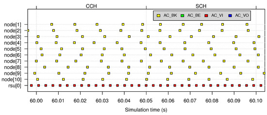In Figure 4, we present the default operation (from the application layer point of view), when sending network packets. We have one video flow sent by a Road-Side Unit (RSU) and 10 packet flows delivering background traffic by 10 moving vehicles (rsu[0] and node[1..10], respectively). Video data are sent with the AC_VI priority, and background traffic is sent with AC_BK priority. Each background traffic vehicle transmits 100 packets per second (pps). Each square block in the figure indicates the exact time at which each packet is scheduled to be sent to the MAC layer; the size (width) of each block does not mean the duration. As indicated in the legend, video packets are shown in red, and background packets are shown in yellow. As it can be seen, the application layer does not take into consideration whether a data packet (either video or background traffic) is sent during a CCH time slot or not.