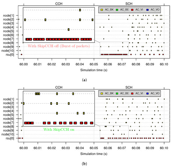 As can be seen in Figure 5a, with the default mechanism (SkipCCH off), there is a burst of delayed packets (both video and background traffic packets) that compete for the channel (magnified for clarity), just at the beginning of the SCH time slot. So the involved nodes enter into the back-off state a lot of times, and, as video packets are prioritized by QoS, they win most of the contentions to the detriment of background traffic. This situation leads to a high number of collisions and, as a consequence, to an average increase in video packet delay and, eventually, to packet losses due to the fact of reaching the maximum number of back-off retries.