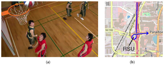 Experimental setup: (a) video sequence: BasketBallDrill; (b) selected area of Las Vegas.