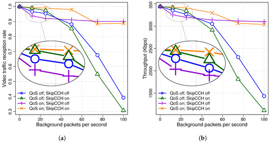 As well as the protection of video packets, another objective to be considered is not to excessively penalize the rest of the network traffic. Figure 13 shows how background traffic is affected under different scenarios by enabling/disabling QoS and SkipCCH for both video-encoding modes.